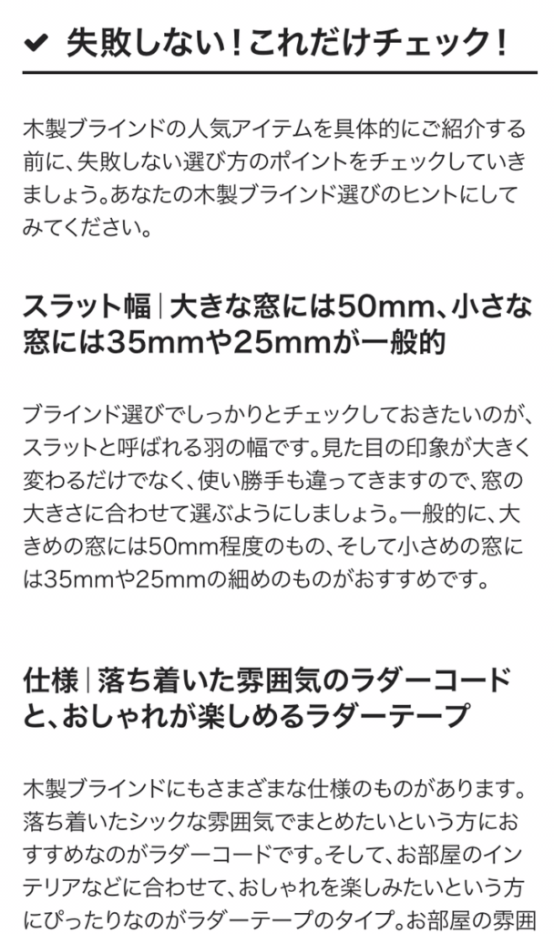 こちらの記事では、ウッドブラインド選びで失敗しないチェック項目、人気メーカー10社の比較など有益な情報がもりだくさん。とても読みやすく、記事を一見するだけでウッドブラインド選びの必要な情報がまるわかりです。