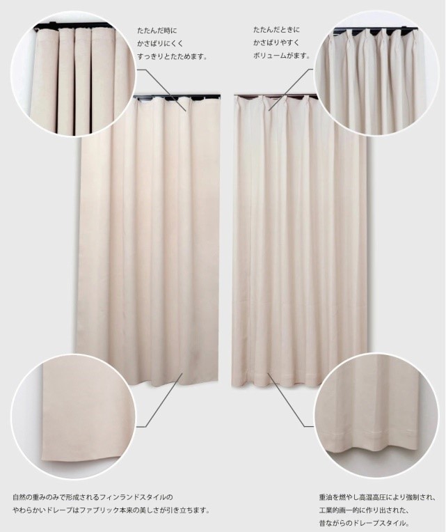 NOKKIのカーテンでは、どのシリーズもフィンランドスタイルを採用しています。フィンランドスタイルの特徴とは、カーテンのひだ山がないこと。ひだ山がないことでドレープがゆったりと柔らかく、従来の日本のカーテンと比較しても生地本来の質感や美しさをより引き立たせます。またひだ山がないことで、束ねたときの見た目もスッキリ。お部屋の印象をスタイリッシュにします。