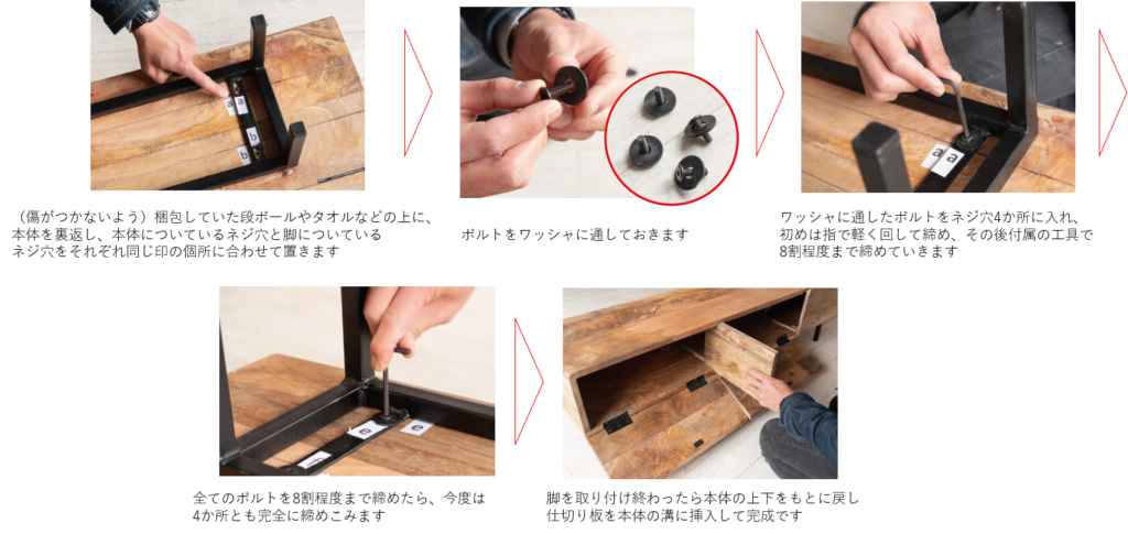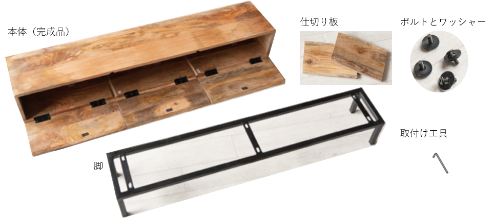 【テレビ台】マンゴー材タイプの組み立て方を教えてください NOKKI 2021.08.03 2022.01.06 まずは同梱品を確認してください。組み立てる部材は本体の中に収納されています。 <同梱品> <組み立て手順> リホームのテレビ台 テレビボード/テレビスタンド