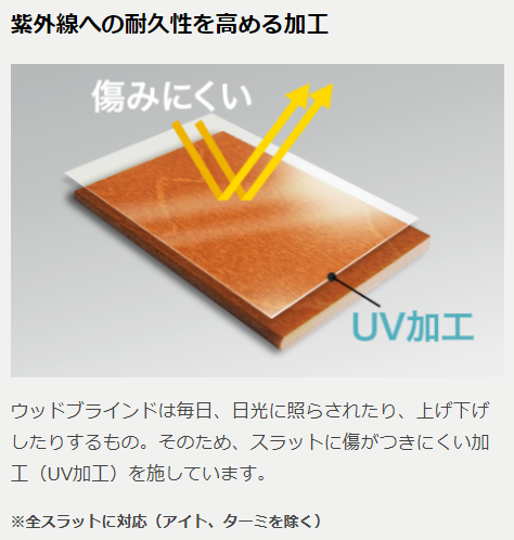 【ウッドブラインド】UVコートとありますが、UVカット加工はされていますか? NOKKI 2021.07.01 2022.01.07 恐れ入りますが紫外線カット加工はございません。 UVコートはスラットを保護し、質感や色味を長持ちさせるために高級家具などで 使用されている加工のことを指します。 リホームのブラインド 取扱ブラインド一覧