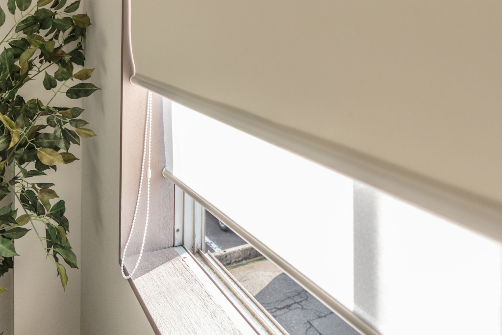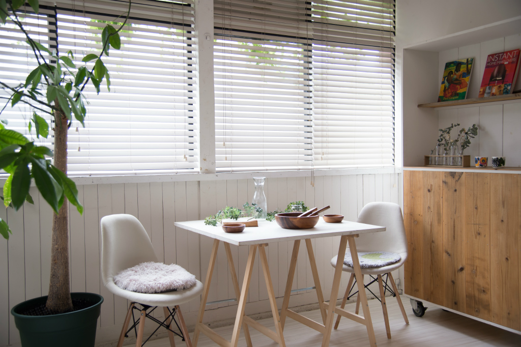 小さな空間には、裾が広がって狭く見えてしまうカーテンよりもロールスクリーンやブラインドがおススメです。