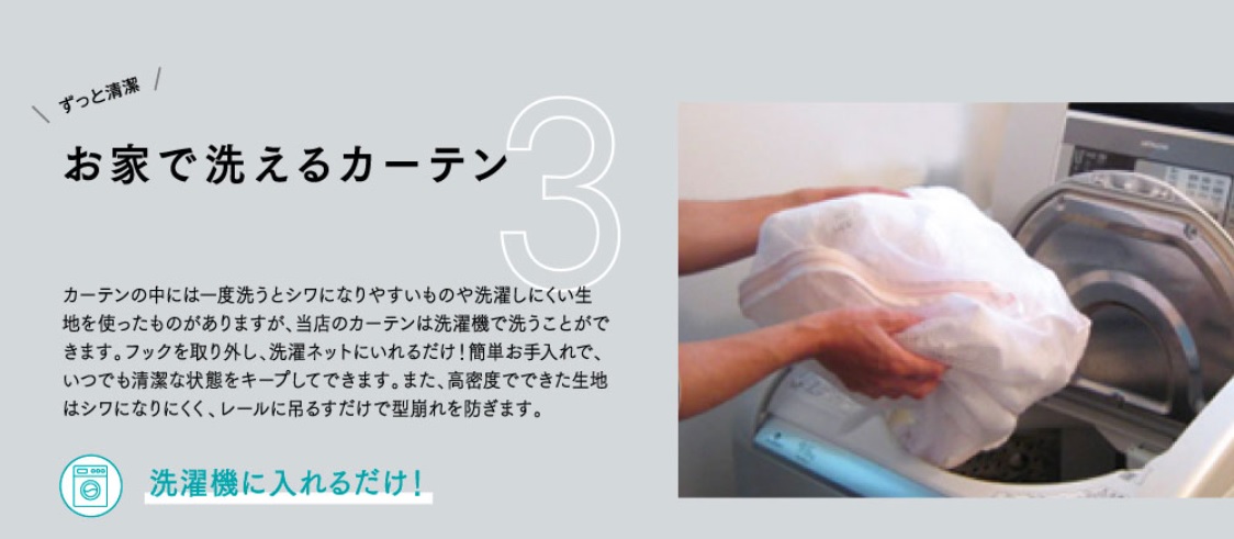汚れても洗濯が可能なウォッシャブルのカーテン、防炎加工の付いたカーテンなら安心です。