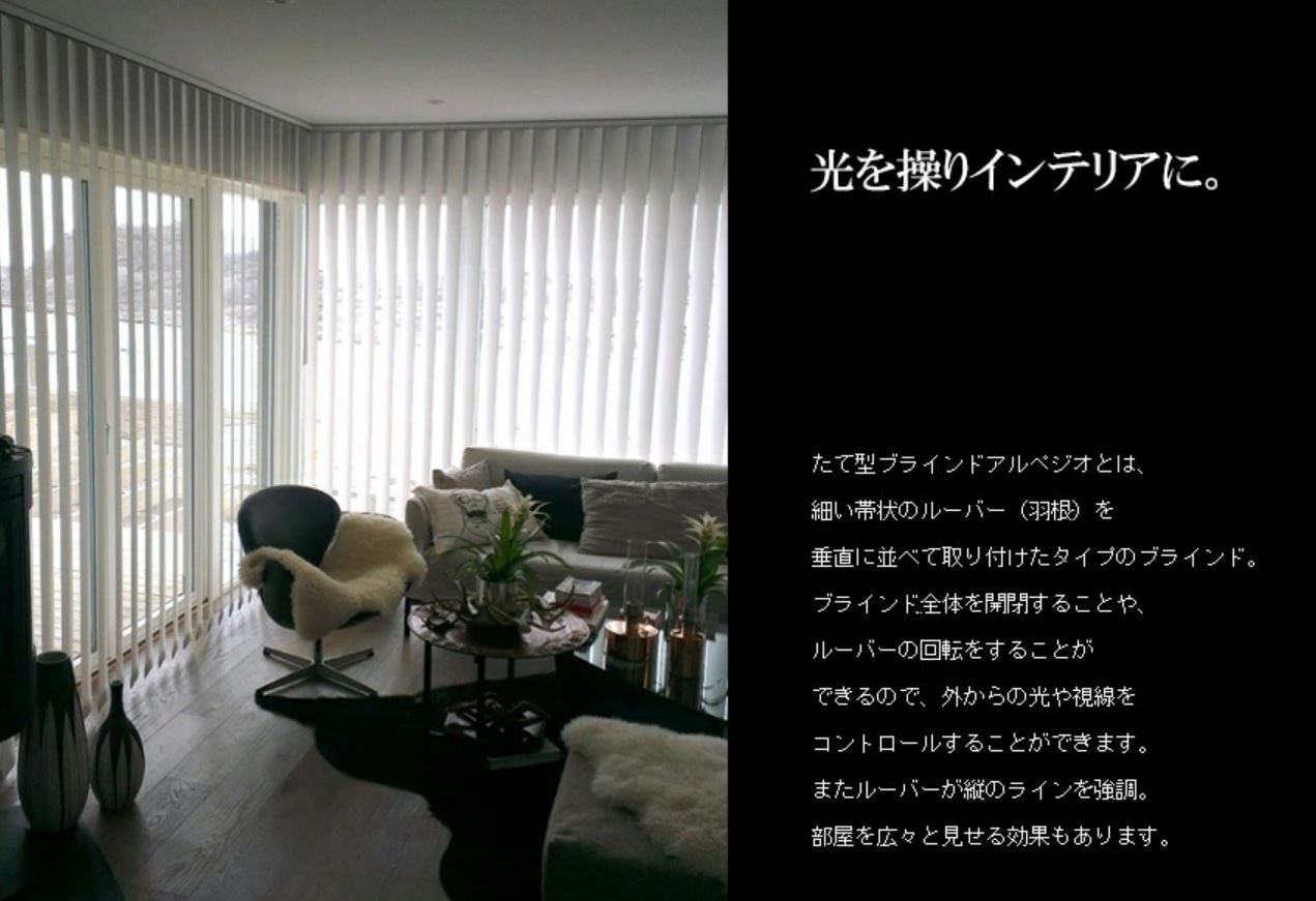 細い帯状のルーバー(羽根)を垂直に並べて取り付けたブラインド。ウッドブラインドやアルミブラインドのスラット(羽根)が横型に連なっているのに対して、こちらは縦型になっています。