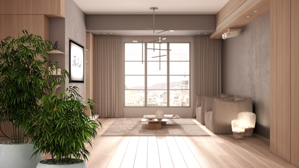 壁に穴をあけることなく取りつけができるウッドブラインドは、賃貸でも憧れのおしゃれなリビングを叶えることができます。