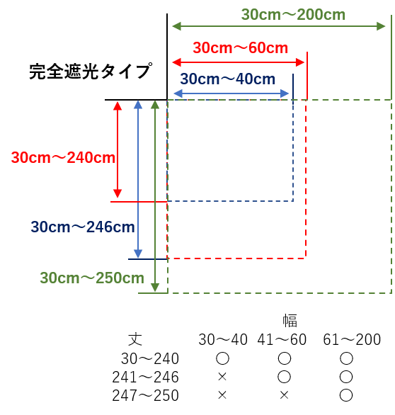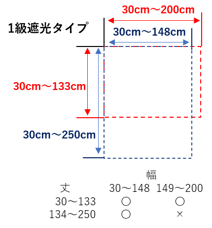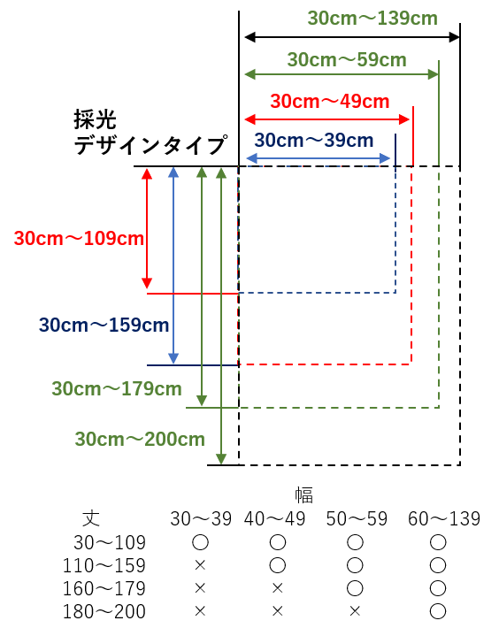 ロールスクリーンの仕様により、以下のように製作可能なサイズがございます。