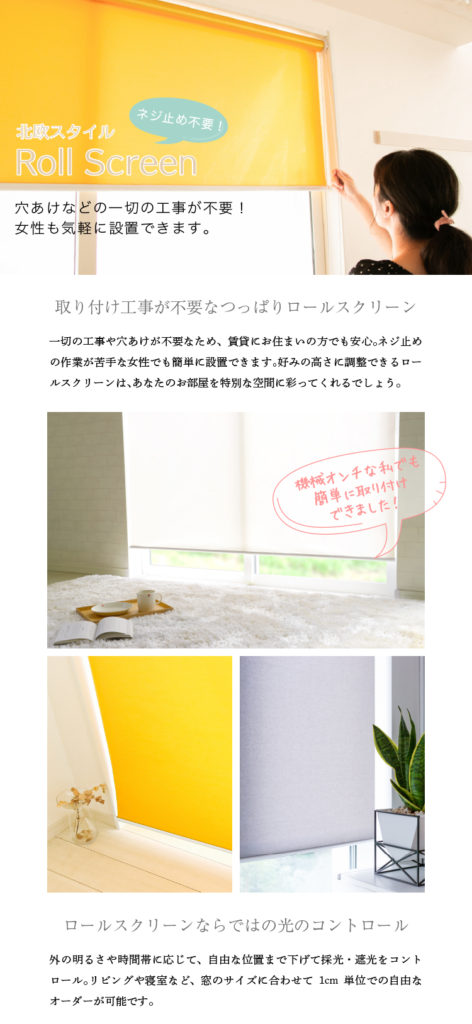 穴あけなどの工事作業が不要で、賃貸にお住いの方も安心して取り付けできます。ねじ止めの作業が苦手な女性でも、簡単に取り付けられるロールスクリーンです。