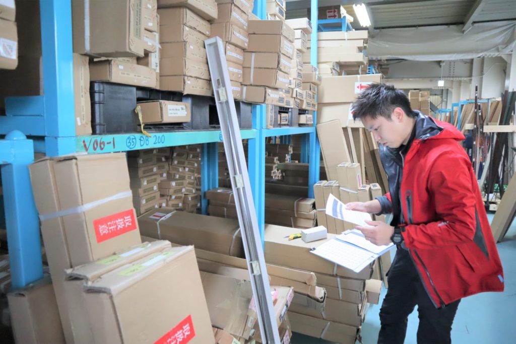 製作だけでなく、出荷業務にも携わっており、広い倉庫内をくまなく回ってお客様の商品をチェックしています。多いときで1日200点近くの商品を扱い、8000歩以上を歩くこともあるそうです。